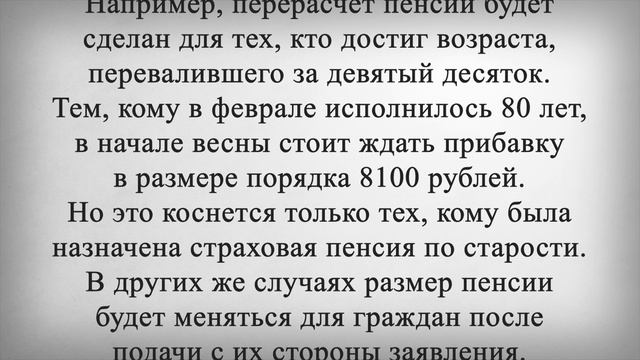 С 1 Марта Новый Размер и Перерасчет Пенсий! Пенсионерам объявили о перерасчете пенсий и выплате их в другом размере уже с марта. Подобная ситуация сложится для многих пожилых граждан в ближайшее время. И зачастую это будет сделано полностью автоматически. Многие пенсионеры могут рассчитывать на то, что уже с марта пенсии им начнут выплачивать в новом размере. Выплаты ожидает перерасчет, который будет делаться по запросу от самих пожилых граждан. Хотя во многих случаях это будет сделано автоматом, но только если в жизни человека произошло определенные изменения. Например, перерасчет пенсии будет сделан для тех, кто достиг возраста, перевалившего за девятый десяток. Тем, кому в феврале исполнилось 80 лет, в начале весны стоит ждать прибавку в размере порядка 8100 рублей. Но это коснется только тех, кому была назначена страховая пенсия по старости. В других же случаях размер пенсии будет меняться для граждан после подачи с их стороны заявления. Например, если пенсионер обнаружит, что у него в общем стаже не был учтен тот или иной период работы, можно принести документы в Социальный фонд, подтвердить стаж и запросить перерасчет выплаты. Также рассчитывать на доплату к пенсии смогут те, у кого на содержании появится близкий родственник. Чаще всего речь идет о детях: если до 18 лет, то никаких документов представлять не нужно, а до 23 лет важно подтвердить, что ребенок учится на очной форме. Размер прибавки за каждого иждивенца составит уже порядка 2700 рублей. Ставьте лайк, если считаете, что в марте всем пенсионерам, нужно дополнительное повышение пенсий, выше реальной инфляции и напишите, какие, по-вашему, должны быть пенсии для комфортной жизни всех пенсионеров?