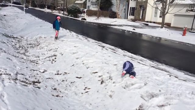Ella in the purple and lavender snow suit is sledding in our neighbors front yard with neighbor kids Isaac and Amelia. Her first sledding!