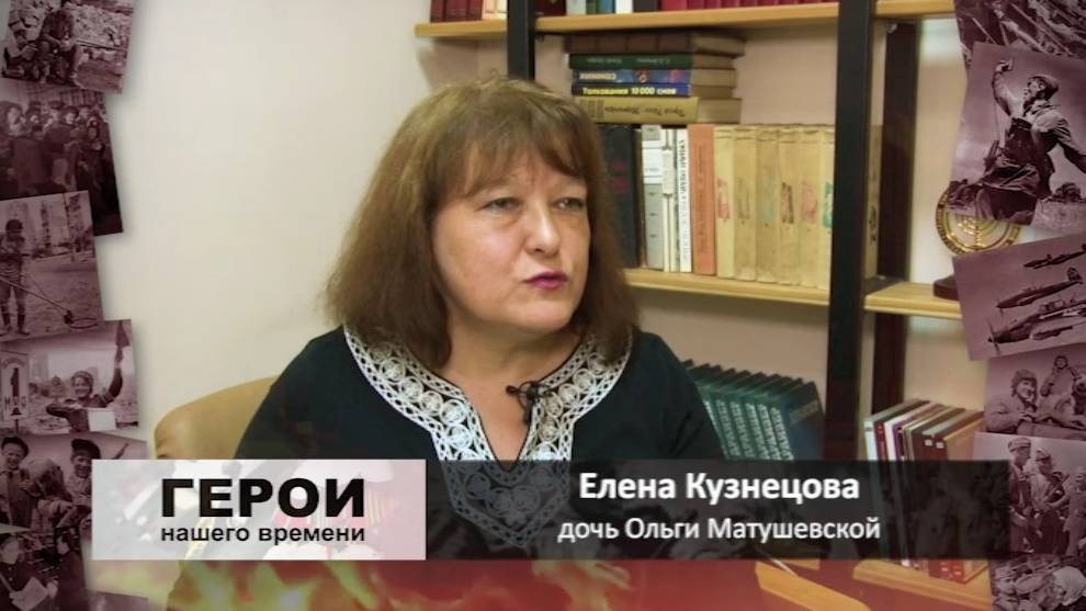 Матушевская Ольга Федоровна (1922-2013 ) родилась 4 июня 1922 года в г. Свободном Амурской области. Накануне войны она поступила в Томский политехнический институт. В том же 41-м она пошла учиться на курсы медсестер, а в марте 1942 года уже была зачислена санинструктором госпиталя. В апреле 1944 года бывшая студентка сменила санитарную сумку на снайперскую винтовку.После войны в Томск она не вернулась – стала студенткой Хабаровского пединститута, а после его окончания приехала по распределению в Еврейскую автономную область. Работала учителем истории, была заведующей Биробиджанским отделом образования, директором Биробиджанской средней школы № 6. Созданный по ее инициативе школьный музей боевой и трудовой славы был признан одним из лучших не только в области, но и среди учебных заведений России.Уже будучи на пенсии и работая методистом Центра детского творчества, Ольга Федоровна сумела собрать и систематизировать огромный материал по развитию молодежного движения в областном центре. Мы помним, мы уважаем, мы чтим героев нашего времени.Цикл программ «Герои нашего времени» создан при поддержке ООО » Транснефть Дальний Восток».