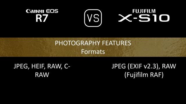 This video overviews the Canon EOS R7 and the Fujifilm X-S10 in a parallel comparison of specifications. Thanks for watching. If you liked this video and found it informative, make sure to subscribe for more. 00:24 LAUNCH 00:32 BODY 00:40 SENSOR 01:05 IMAGE 01:21 OPTICS & FOCUS 01:45 SCREEN 02:02 VIEWFINDER 02:18 PHOTOGRAPHY FEATURES 03:19 VIDEOGRAPHY FEATURES 03:35 STORAGE 03:39 CONNECTIVITY 04:08 PHYSICAL 04:28 MISC