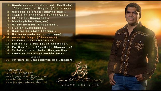 Disco: CHACO ARDIENTE // Lanzamiento 27 de Diciembre del 2014. Título: Amor de Fuego // Letra y Música: Cristian Javier Mamani Lewkowski // Ritmo: Chacarera FICHA TÉCNICA Voz: Juan Pablo Fernández Artista Invitada Tema 15: Glendy Villegas Bajo: Sebastian Aramburu Guitarras Nylon, Acústicas, Eléctricas: Sebastian Aramburu Ukelele: Sebastian Aramburu Violín: Adrián Rengifo, Tema 9: Rene Gómez Charango: Isaac Abán, Tema 2: Sebastian Aramburu Vientos: Franco Abán Secuencias y Accesorios: Pablo Avila Teclado: Rodolfo Avellaneda Batería: Ramiro Aramburu Percusión: Javier Duran Bombo y Sachas: Sebastian Nolasco Bandoneón y Acordeón: Germán Mercado Coros: Lucia Checa, Noelia Catalán, Glendy Villegas Grupo Invitado Tema 12: Javú Animaciones: Juan Pablo Fernández Producción y Dirección Artística: Sebastian Aramburu Arreglos: Sebastian Aramburu, Pablo Avila Producción Ejecutiva: Juan Pablo Fernández y Déjà Vu Trading Company S.R.L. Grabado en: Estudio La Bulla, Salta - Argentina Entre Septiembre y Diciembre del 2014 Técnico de Grabación: Pablo Avila Mezclado y Masterizado por: Martin Wolmy en Wolmyx Mezcla y Mastering, Salta Argentina. Idea y Diseño de Arte de Disco: Diego Verón - www.kuboproductora.com.ar Fotografía: Dario Arce Vestuario: Taos Un agradecimiento especial a los autores de las obras y al equipo de producción por el trabajo realizado. Para mis viejitos queridos "Matilde y Pablo", mis hermanos que son los ángeles de la guarda que tengo (Carla, Marisol, José Guillermo, Oscar) Un abrazo grande para ese cofre lleno de amigos que Dios me dio y como siempre a la gente de (Salvador Mazza - Yacuiba), Tartagal, Salta, Tarija, Tucumán, Santiago del Estero, Valencia, Chaqueños, Salteños, Guazapa, El Salvador, Buenos Aires, Córdoba, Santa Fe, Mendoza, Entre Ríos, Misiones, Chaco, Corrientes, Jujuy, San Juan, Río Negro, Formosa, Neuquén, Chubut, San Luis, Catamarca, La Rioja, La Pampa, Santa Cruz, Tierra del Fuego, Los Toldos, Nazareno, Santa Victoria, Campo Quijano, Rosario de Lerma, El Potrero, Rosario de la Frontera, Rivadavia Banda Norte, Rivadavia Banda Sur, Colonia Santa Rosa, Hipólito Yrigoyen, Pichanal, San Ramón de la Nueva Orán, Urundel, Molinos, Seclantás, El Galpón, San José de Metán, Río Piedras, San Antonio de los Cobres, Tolar Grande, Coronel Moldes, La Viña, La Poma, El Jardín, El Tala, La Candelaria, La Caldera, Vaqueros, Iruya, Isla de Cañas, Guachipas, Aguaray, Embarcación, General Ballivián, General Mosconi, Campo Santo, El Bordo, General Güemes, Chicoana, El Carril, Cerrillos, La Merced, Villa San Lorenzo, Cachi, Payogasta, Apolinario Saravia, El Quebrachal, General Pizarro, Joaquín Víctor González, Las Lajitas, Anta, General José de San Martín, Los Andes, Bermejo, Padcaya, Entrerios, San Lorenzo, El Puente Áviles, Yunchara, Carapari, Villamontes, Valle de la Concepción, Aniceto Arce, Burdet O'Connor, Cercado, Eustaquio Méndez, Gran Chaco, José María Avilés, Uriondo, Palmar Chico, Grande, Caiza, Sanandita, Pilcomayo, Tarairí, Aguairenda, Algarrobal, Alto Ipaguazi, Barro Negro, Cañón Seco, Chañar, Chimeo, Chocloca, Cortadera, Crevaux, El Mistolar, El Pajonal, El Sauzal, Ibibobo, Iñiguazu, Itaperenda, Yaguacua . Voy a estar subiendo canciones conocidas de folklore Argentino: El Chaqueño Palavecino (Oscar Esperanza Palavecino), Dalmiro Cuellar, Peteco Carabajal, Yalo Cuellar, Los Nocheros, José García, Soledad Pastorutti, Juan Enrique Jurado, Sangre Argentina, El Negro Palma, Jorge Cafrune, Roxana Carabajal, Los Chalchaleros, Enriqueta Ulloa, Los Manseros Santiagueños, Tamara Castro, Los Fronterizos, El Gorrión Ojeda, Horacio Guarany, Los Hermanos Abalos, Chaco Herencia, Los Puesteros, Luciano Pereyra, Los Tekis, Facundo Toro, Dúo Coplanacu, El Negro Salvatierra, Las voces de Orán, Los tres del río, Abel Pintos, El Chango nieto, Los Fronterizos, Pitín Salazar, El Toba Toledo, Los Cantores del Alba, Jorge Rojas, Gastón Cordero, Carlos di Fulvio, Facundo Toro, Los hermanos Rendón, Elmer Acosta, Tola Claudio, Los Canarios del Chaco, Dalmiro Cuellar, Santos Quispe, Vale Cuatro, Los Huayra, Esther Marisol, Sin Fronteras, Mariana Carrizo, Marcela Ceballos, Taricanto, Diableros de Orán, Luchín Zeballos, Mirian Wayar, Maritza Donaire, El violín chucaro, Los de Afatal, Los de Aguaray, Las voces del alba, La Juntada, Hermanos Calvo, Las voces del camino. Cosquín 1992, 1993, 1994, 1995, 1996, 1997, 1998, 1999, 2000, 2001, 2002, 2003, 2004, 2005, 2006, 2007, 2008, Festifront, Festival del trichaco, Festival de la tradición Chaqueña, María Jesús, Feria de mataderos, Villa María, Fiesta nacional del poncho, Plaza de las carretas, Seretana a Cafayate, Jorge Rojas, Chila Jatun, Los Karjkas