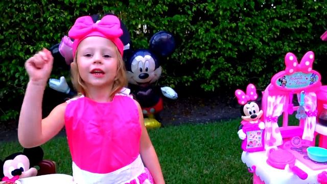 Настя ждет Минни и Мики Мауса и готовит на детской игровой кухне