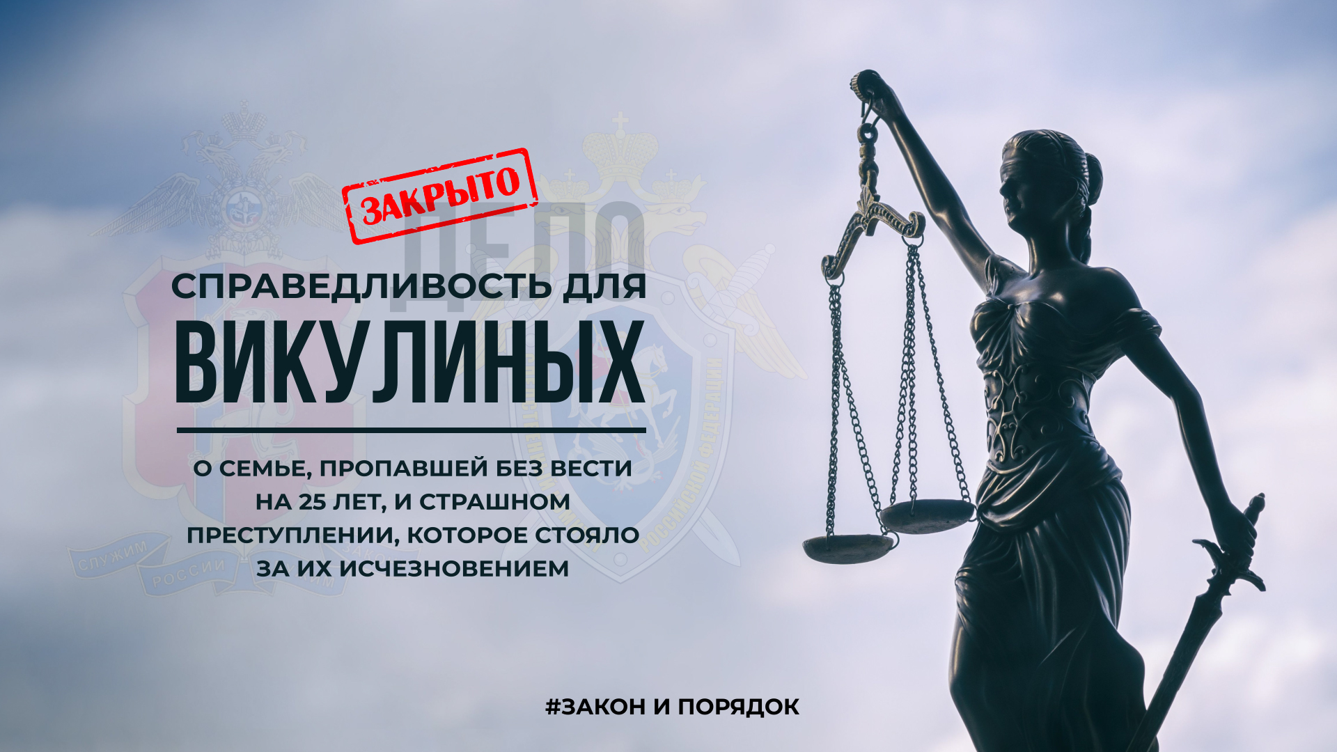 О семье, пропавшей без вести на 25 лет, и страшном преступлении, которое стояло за их исчезновением, рассказываем в новом выпуске нашего документального цикла КАТЕГОРИЯ «ОСОБО ТЯЖКИЕ». В начале июня 1998 года с экранов красноярских телеканалов не сходила шокирующая история об исчезновении из собственной квартиры семьи Викулиных. Отец, мать и 6-летняя дочь пропали, а в их жилище остались следы крови и выстрелов. В ходе подготовки этого выпуска мы встретились с оперативниками и следователями, которым спустя четверть века удалось сделать прорыв в, казалось бы, безнадежном деле, подняли архивные материалы и побывали на местах преступления. А еще мы обратились к родственникам семьи Викулиных, чтобы узнать их честную реакцию на развязку этой криминальной трагедии. Смотрите тру-крайм от пресс-службы краевой полиции и следственного комитета здесь и во всех аккаунтах в социальных сетях «Полиции Красноярья», оставляйте реакции и комментарии, делитесь этим видео.