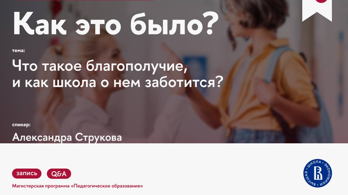 Тема: Что такое благополучие, и как школа о нем заботится? Докладчик: Струкова Александра, аспирантка Института образования, стажер-исследователь Центра исследования современного детства НИУ ВШЭ, учитель русского языка. В рамках встречи обсудим: - как в научной литературе определяют термин «благополучие» - как определение благополучия может быть полезно для практиков в сфере образования - что значит «заботиться о благополучии» - что может делать школа, чтобы поддерживать благополучие учеников