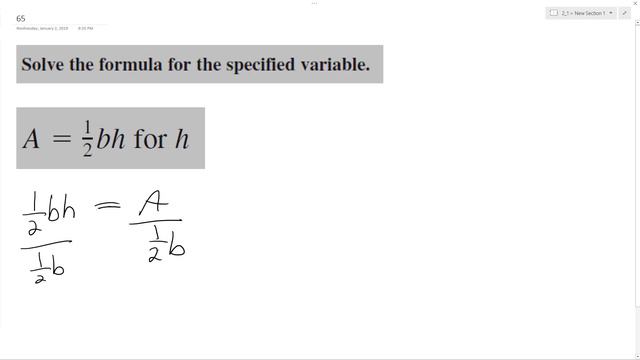 A = (1/2)bh for h, solve for the specified value