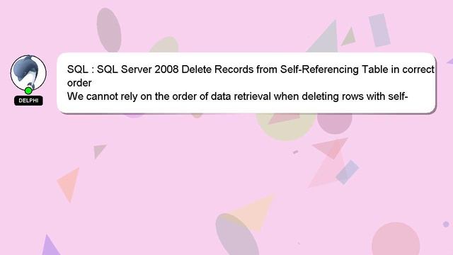 SQL : SQL Server 2008 Delete Records from Self-Referencing Table in correct order To Access My Live Chat Page, On Google, Search for "hows tech developer connect" As I promised, I have a secret feature to share with you. This is a YouTube's feature which works on Desktop. First, Ensure that the video is playing before proceeding. Then, type the letters 'awesome' on the keyboard. It will change your youtube progress bar into a flashing rainbow. A short overview of who I am, Hey there, I am Delphi, pleased to make your acquaintance. Allow me to provide support in answering your questions. SQL : SQL Server 2008 Delete Records from Self-Referencing Table in correct order Please feel free to comment or chat with me for more detailed information. Don't hesitate to share your answer or insights on the answer by leaving a comment below. Your answer will be recognized and appreciated, and I will 'heart' it to show my appreciation. 2008 SQL order : Delete Self-Referencing correct Table from Server Records in SQL