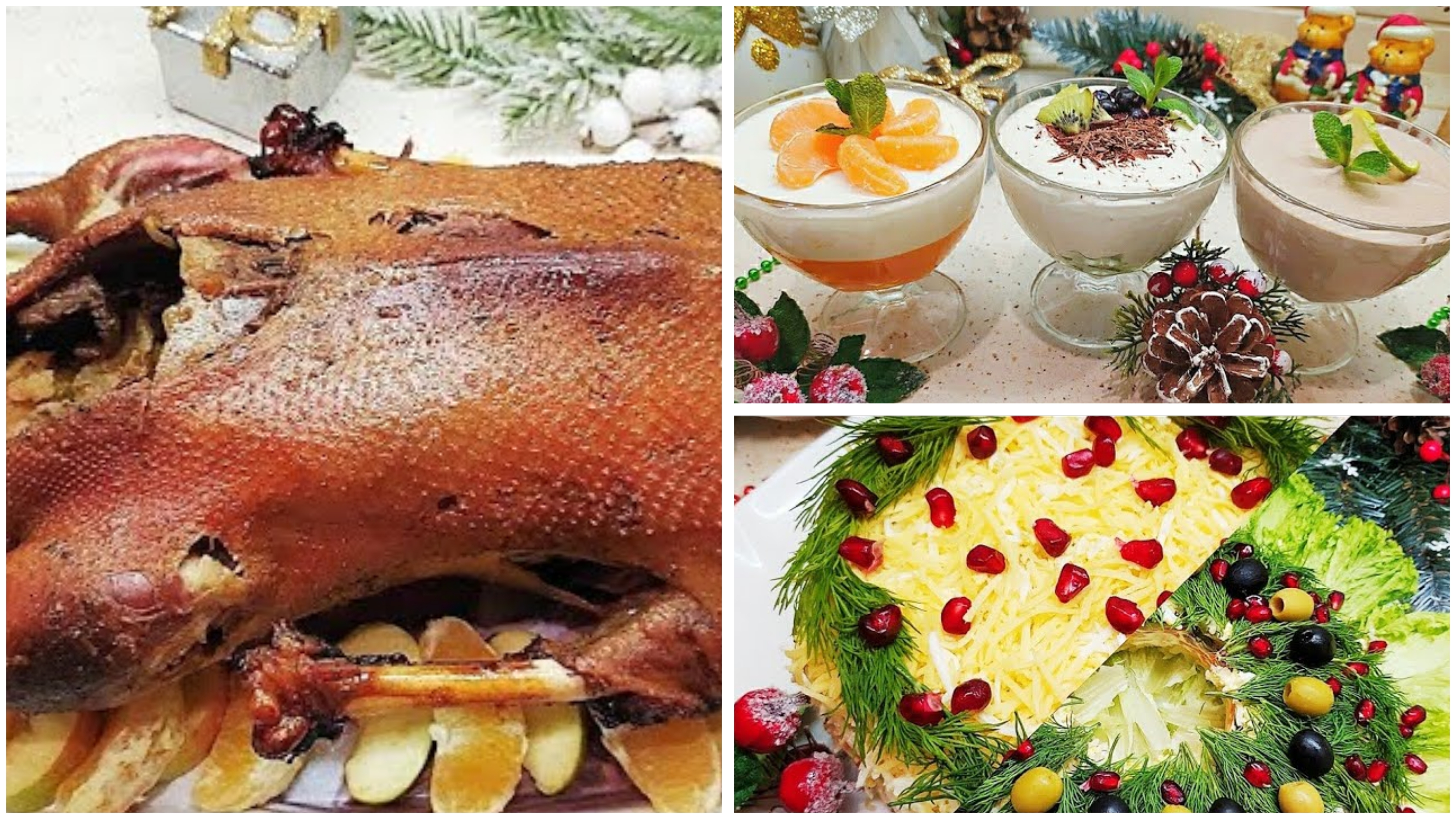 Салат-1: Картофель-3средних,Морковь-2средних,Телятина-300гр, Маринованные огурцы-4средних, Яйца-4шт, Майонез,Укроп-1пучок. Для украшения: Оливки,зерна граната. Салат2: Картофель-3шт, Морковь-2шт, Шампиньоны-200гр+луковица-1шт(обжариваем), Куриное филе-300гр, Огурцы маринованые-4шт, Яйца-3-4шт, Твердый сыр-100гр, Майонез, Укроп. Соль и перец по вкусу. ГУСЬ! Для маринада: Сок Апельсина, Соевый соус-100мл, Мёд-1ст.л, Корень имбиря -1ст.л. Соль ,Перец,Тимьян. 1-й десерт: Творог-300гр,Сметана-100гр,Сахар-по вкусу,Желатин15гр-развести в 50мл,воды, Ванильный сахар при желании,Какао порошок-2ч.л. 2-й десерт: Мандарины-450гр(сок с них),Сахар по вкусу, Желатин 15гр на 50мл воды. Для белого слоя: Сметана20%- 250гр, Сахар-1ст.л+ по вкусу,Желатин- 15гр на 50мл воды. 3-й десерт: Сливки 33% -200мл, Зефир-4шт.