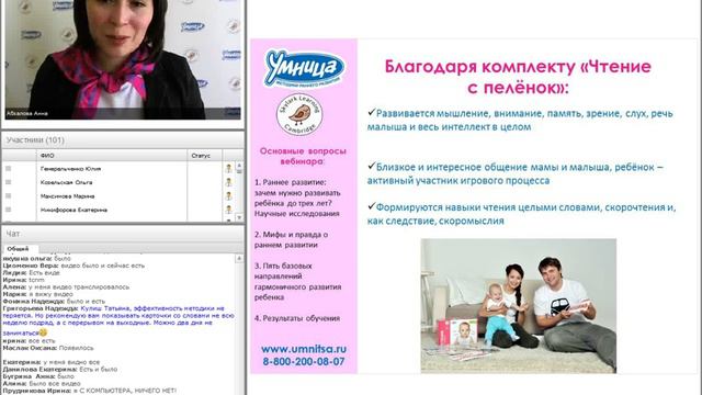 На вебинаре освещены следующие темы: -преимущества и важность раннего развития интеллекта ребенка; -мифы и правду о раннем развитии; -результаты исследований успехов детей, занимающихся с рождения; -истории успеха маленьких и больших умниц и их родителей. А также вы узнаете о «Программе развития интеллекта» от компании «Умница. Вебинар проводит Анна Абзалова – специалист по раннему развитию компании "Умница".