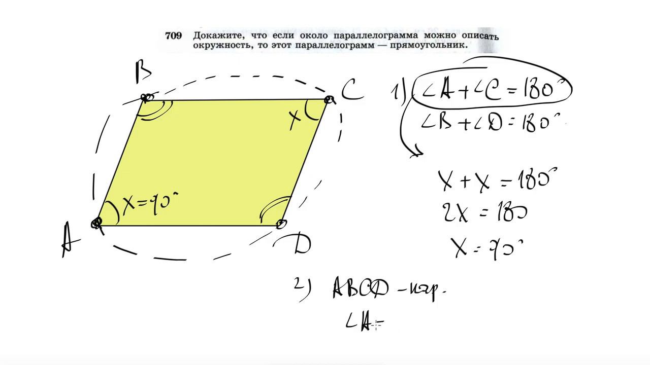 №709. Докажите, что если около параллелограмма можно описать окружность, то этот параллелограмм