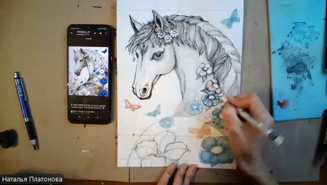 Лошадка с бабочками и цветами (графика)