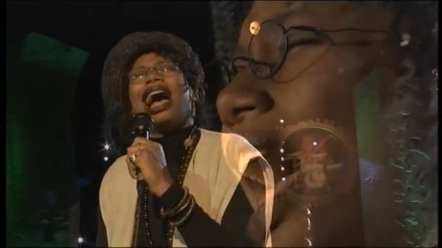 Женщина Рейчел Феррелл в очках поет песню