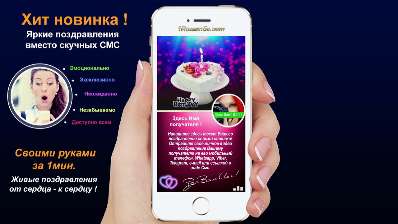 ЗАПОЛНИТЬ ЭТУ ОТКРЫТКУ СЕЙЧАС: https://1romantic.com/musicalnye-pozdravleniya/ty-krasiva/ Дорогие друзья! Вам остаётся только, написать нужный вам текст и загрузить свою фотографию. 1Romantic.com Является первым и единственным в мире сервисом интерактивных видео поздравлений. Мы используем собственную уникальную технологию, добавляя ежедневно самые новые и последние разработки программирования. У нас Вы можете найти поздравления на любой вкус, только высокого качества и разрешения. Согласитесь, всегда приятней, отправить поздравления от себя лично, чем пересылать чужие, с уже заготовленным стандартным и быстро мерцающим текстом, как рекламный баннер, пересылаемый друг-другу от тысячи к тысячам где нет Ваших Имён. Задумайтесь ! Это выглядит слишком наивно и как минимум глупо, особенно для людей которые умеют писать и читать (на мою розочку сверкалку или стикер и отвали). Теперь всё будет иначе ! Вы можете сами передать своё настроение, тем людям, которым Вы будете адресовать своё поздравление. Теперь Вы сами, творец, художник и поэт своих чувств, наполняя видео открытку своими словами, излучая только самое доброе, искреннее из своих тёплых сердец. Загрузить свою любимую фотографию или фотографию получателя, что безусловно, будет гораздо приятней и неожиданней для него) Безусловно, мы подумали и о музыкальном оформление. Наверняка, Вы будете подбирать нужные слова и фотографию под ту песню, которую Вы захотите загрузить сами, а не ту которую Вам навязывают. Ну и самое главное, Вы можете использовать функцию добавления своего голоса, программа сама наложит Ваш голос на начало загруженной песни. Поверьте это очень оригинально, особенно если Ваш друг не слышал Вас долгие годы. Такое поздравление можно сделать действительно за 30-60 сек. Но если Вы творческий человек, оно не отпустит Вас так быстро))) И Вы будете думать, сочинять, плакать, улыбаться, восхищаться, раскрыв в себе новые таланты... возможно это станет Вашим первым собственноручным творением . Удачи Вам ! С уважением, Ваши Романтики ! Краткий список предлагаемых нами поздравлений... Поздравления с днем рождения женщине. Поздравления с днем рождения мужчине. Поздравления с днем рождения другу. Поздравления с днем рождения подруге. Поздравления с днем рождения для детей. Поздравления с днем святого Валентина. Поздравления Папе. Поздравления с днем рождения Маме. Прикольные поздравления. Видео поздравления с днем рождения. Музыкальные поздравления с днем рождения. Слайд-шоу с днем рождения. и многое-многое другое.