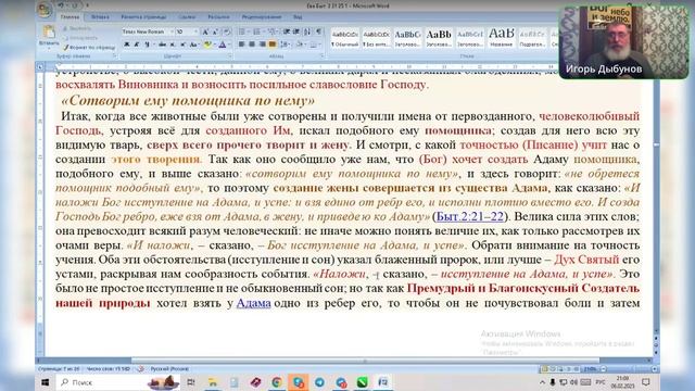 Бытие 2 глава. Сотворение жены. Игорь Владимирович. 06.02.2025