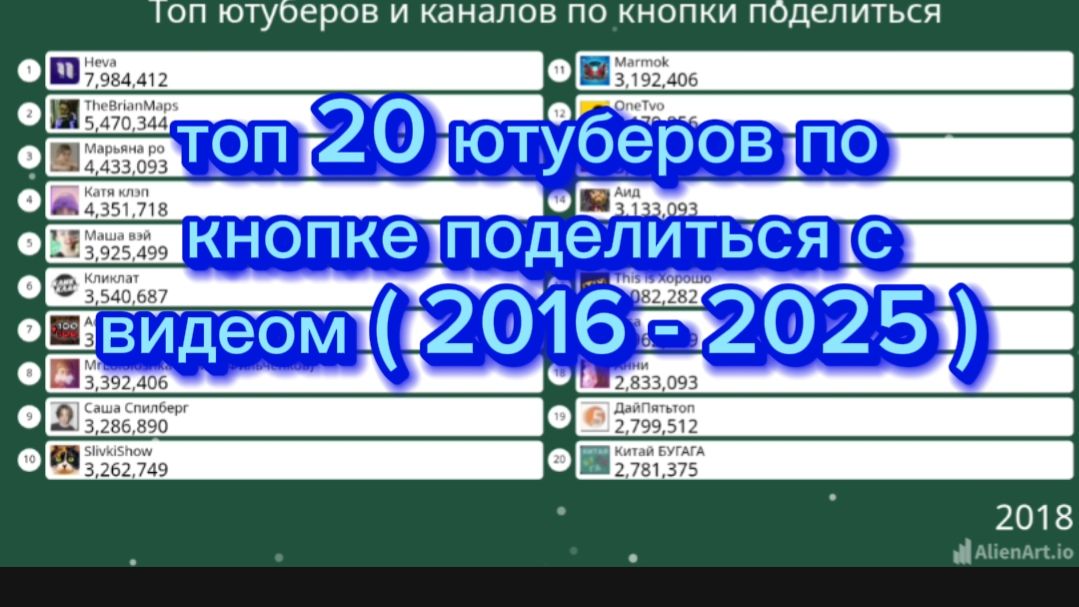 Топ 20 ютуберов по количеству поделится с видео до 2025 года