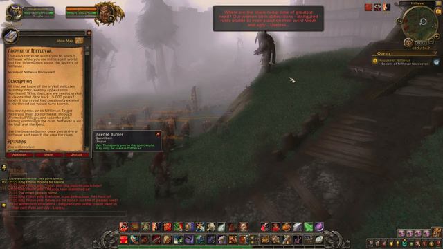 World of Warcraft: Anguish of Nifflevar - Quest ID 11344 (Gameplay/Walkthrough) - Quest information: Thoralius the Wise wants you to search Nifflevar while you are in the spirit world and find information about the Secrets of Nifflevar. - Relevant Locations: This quest starts and ends in Howling Fjord. - Description: All that we know of the vrykul indicates that they only recently appeared in Northrend. Why, then, are we seeing vrykul in visions that date back 15,000 years? Surely if the vrykul had previously existed in Northrend we would have known. You must press on to Nifflevar. To get there you must go northeast, through Wyrmskull Village, and take the path leading up through the dam. Nifflevar is on the bluffs of the fjord. Use the incense burner once you arrive at Nifflevar and search the area for clues. - Completion: Human children born of vrykul? And Ymiron ordered the deaths of all human born offspring? Thoralius goes silent for a moment. As much as I wish to deny what is so plainly presented to me, I cannot. There is no extinct "missing link" to humans as the Explorers' League proposed. The vrykul are the missing link. They are the progenitors of humanity. ---------------------- Howling Fjord is the other Northrend zone open at level 58. It is the eastern-most zone in Northrend, with breathtaking mountains, cliffs, and fortresses. Prior to 7.3.5, it was considered more challenging to level in this zone because of the steep mountains and windy paths between quest objectives compared to the flat plains of Borean Tundra. However, with flying changes, you can fly in Northrend at level 60 via Expert Riding so this zone is less challenging. Alliance players learn about the reawakened vrykul, the prototype for humans, while Horde players assist the Forsaken in developing a new plague (perhaps with ethical qualms) to defeat the Lich King. Both sides also assist the Tuskarr in putting the spirits of their ancestors to rest, as well as aiding a group of humorous pirates. Howling Fjord ranges from levels 10-30.