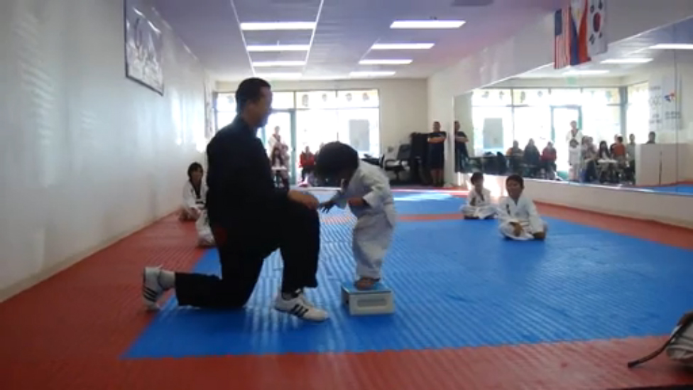 Маленький мальчик пытается разбить дощечку на Тхэквондо