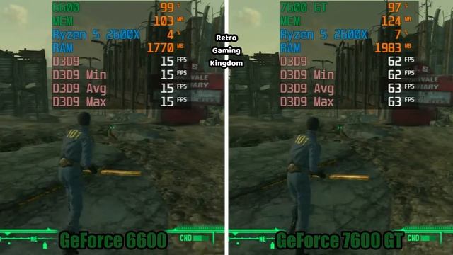 MSI NVIDIA GeForce 6600 256 MB vs ASUS NVIDIA GeForce 7600 GT 256 MB GPU-Z Specs: https://drive.google.com/file/d/1cMRbNXyO3q6RPvrmSpqI8R--RcYmpY69/view?usp=sharing https://drive.google.com/file/d/1AExUhCU2FhIfwKxywUB2iPn5L871ftQ3/view?usp=sharing All Games are in 1280x1024 0:00 Intro 0:07 Grand Theft Auto: San Andreas 0:48 Soldier of Fortune II: Double Helix 1:14 Call of Duty 2 1:38 Fallout 3 - Low 2:23 Half-Life 2 PC Specs: Motherboard: Asus Prime A320 M-K CPU: AMD Ryzen 5 2600X 3.6 GHz base 4.25 GHz boost 16 MB L3 (6c, 12t) GPU: GeForce 6600 256 MB or GeForce 7600 GT 256 MB RAM: 8 GB DDR4 2400 MHz Crucial (1 Stick) OS: Windows 7 64 bit (Officially doesn't support ZEN or Coffee Lake CPUs this is modified version) Drivers: GeForce 6600 256 MB - 9.18.13.908 (NVIDIA 139.08) / Win 7 64 GeForce 7600 GT 256 MB - 9.18.13.908 (NVIDIA 139.08) / Win 7 64 Capture Card: HDMI Video Capture - HDMI to USB Together with VGA+Audio to HDMI Convertor (and DVI-I to VGA) Game Settings: GTA San Andreas Brightness: 11/16 Legend: Off Radar Mode: Map and Blips Hud Mode: On Draw Distance: 5/16 Frame Limiter: Off Widescreen: Off Visual FX Quality: High Mip Mapping: On Anti Aliasing: Off Resolution: 1280x1024 32bit Soldier of Fortune 2: Double Helix Light Flares: Simple Resolution: 1280x1024 Full Screen: Yes Texture Quality: High Texture Filter: Trilinear Vertical Sync: Off Quincunx Multisampling: Off Anisotropic Filtering Level: Lowest UI Texture Quality: High Colors: Auto (Same as Desktop 32 bit) FSAA: Off Alias Shaders: Off Advanced Texturing: On Curve Subdivisions: Medium Image Format: DXT5 Compressed Alpha Image Format: DXT5 Compressed OPENGL Extensions Generic: Yes ATI or NVIDIA Specific: Yes Call of Duty 2 Resolution: 1280x1024 Frequency: 60 MHz Aspect Ratio: Auto Texture Filtering: Trilinear Anti-Alliasing: Off Rendering Method: DirectX7 Vertical Sync: Off Optimization for SLI: Off Soften Smoke Edges: off Number of Corpses: Normal Textures: Texture Resolution: Extra Map: Extra Mirror Map: Extra Fallout 3 Low Resolution: 1280x1024 Antialiasing: Off Anisotropic Filtering: Off Vertical Sync: Off Screen Effects: None Advanced: Detail: (Low) Texture Quality: Medium Radial Blur Quality: Low Depth of Field: No Transparency Multisampling: No Decal Cap: 2 Water: Water Refractions: No Water Reflections: No Reflection Quality: Can not set Soft Reflections: Can not set Full Scene Reflections: Can not set Full Detail Reflections: Can not set Water Displacement: No Depth Fog: No Water Multisampling: Low Shadows: Enable Shadows: No Shadow Quality: Can not set Shadow Filtering: Can not set Max Interior Shadows: Can not set Max Exterior Shadows: Can not set View Distance: Object Fade: 2 Actor Fade: 2 Grass Fade: 0 Specularity Fade: 2 Light Fade: 2 Item Fade: 1 Shadowe Fade: 1 Distant LOD Tree LOD Fade: 0 Object LOD Fade: 25 Land Quality: 75 Half Life 2 Resolution: 1280x1024 Model Details: High Texture Details: High Shader Details: High Water Details: Reflect Everything Shadows Details: High Game UI Color Correct: On Anti Aliasing: None Filtering Mode: Trilinear Vsync: Off Game UI hdr Level 2