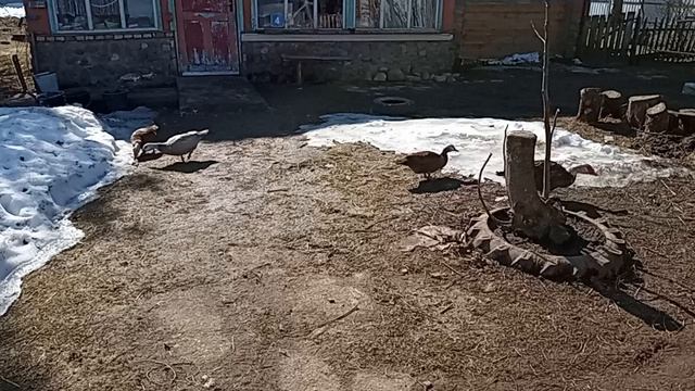 28 марта 2026 года. Суббота. Дом у озера. Коза и собака, утки. Белочка хочет вылезти в окно, но под окном лежит Султан, а она его пока боится. 🐐🛖🐕🦺 Утки гуляют целый день и копаются в земле и снегу.