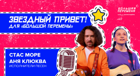 ?Наши добрые друзья, «голоса» «Большой перемены» Стас Море и Аня Клюква, чьи песни известны каждому участнику записали специально для тебя эксклюзивный, особенно теплый, музыкальный «Звездный привет». Он приурочен к окончанию учебного года, и сейчас ты услышишь отрывок из новой песни Стаса и Ани. Разучивай, подпевай и начинай отдыхать! #БольшаяПеремена #ЗвездныйПривет