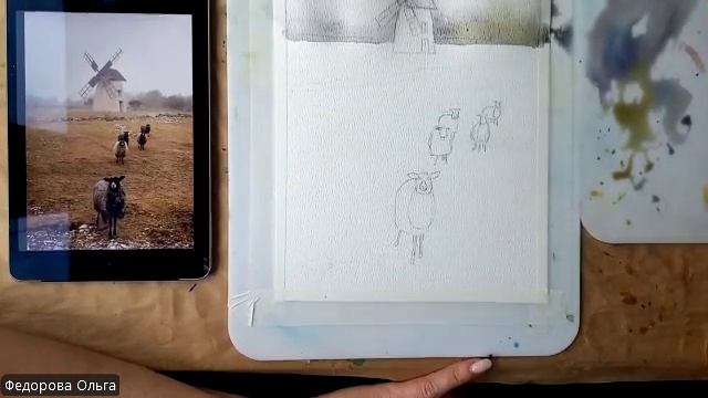 Акварель. Мельница и овечки
