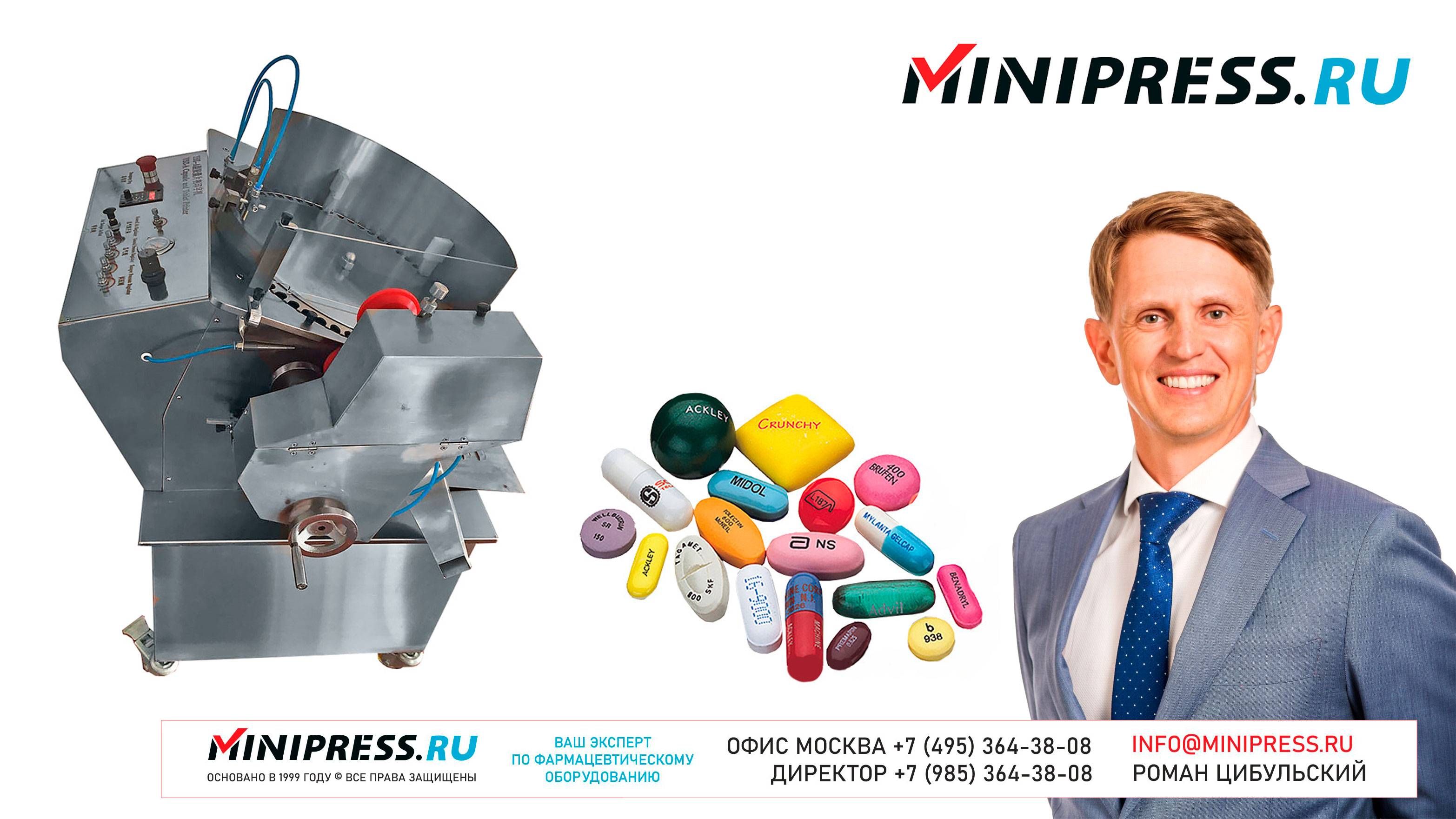 Автоматическая машина для нанесения логотипа на таблетки YS-01 https://Minipress.ru/katalog/ Фармацевтическое оборудование. Специалисты в фармацевтическом оборудовании и технологиях производства лекарств. Более 20 лет оказываем нашим клиентам помощь в выборе, поставке, наладке различного фармацевтического оборудования! Вы в поиске надежного поставщика оборудования? Мы предоставим вам лучший сервис 24/7. Собрана лучшая команда профессионалов в фармацевтической отрасли и налажены стабильные связи с лучшими производителями. Мы не только продаем, но и производим многие модели оборудования Директор компании Минипресс Роман Цибульский Поставка фармацевтического оборудования в Россию Пишите: info@minipress.ru Телефон +7(495)364-38-08; Мобильный +375(29)308-00-00 Россия, Москва Skype: RomanTsibulsky; ICQ: 310-134-490 Подписывайтесь на наш видео канал на Youtube https://youtube.com/user/wwwMinipressru Обновленный сайт https://Minipress.ru Каталог оборудования https://Minipress.ru/katalog/ МЫ В СОЦИАЛЬНЫХ СЕТЯХ G+ https://plus.google.com/+RomanTsibulsky/ FB https://facebook.com/roman.tsibulsky YOUTUBE https://youtube.com/user/wwwMinipressru IN https://ru.linkedin.com/pub/roman-tsibulsky/a6/933/661 БОЛЬШОЙ КАТАЛОГ ФАРМАЦЕВТИЧЕСКОГО ОБОРУДОВАНИЯ https://minipress.ru/katalog/ Постоянно обновляемый каталог различного фармацевтического оборудования с фотографиями, описаниями, видео и ценами. ПЕРСОНАЛЬНЫЙ МЕНЕДЖЕР 24 ЧАСА https://minipress.ru/katalog/ Вы общаетесь по всем вопросам, с момента первой консультации и до получения оборудования, с одним специалистом. СПЕЦИАЛИСТЫ И ТЕХНОЛОГИ https://minipress.ru/katalog/ Имеем обширные связи в фармацевтической среде, найдем любого специалиста, поможем с освоением оборудования и технологий. ОБСУЖДЕНИЕ ВАШИХ ИДЕЙ ПО ПРОИЗВОДСТВУ ПРОДУКЦИИ https://minipress.ru/katalog/ Поможем в оценке ваших идей. Большой опыт в организации различных производств и выпуске продукции. Ценные советы. ФАРМАЦЕВТИЧЕСКОЕ ОБОРУДОВАНИЕ Мы поставили перед собой задачу, помогать нашим клиентам в правильном выборе фармацевтического оборудования. Многолетний опыт подобной деятельности показывает, что многие клиенты сталкиваются, в первую очередь, с непониманием технологического процесса. Покупка оборудования должна быть финальной точкой после подробного обсуждения задачи, консультацией с производителем оборудования, отправкой сырья и материалов на фабрику, тестирования в работе. ДЛЯ ТАБЛЕТОК https://minipress.ru/katalog/category/farmacevticheskoe_oborudovanie/ Смешивание порошков, гранулирование, прессование, обеспыливание, покрытие оболочками, фасовка, упаковка, счет, нанесение логотипов ДЛЯ ЖЕЛАТИНОВЫХ КАПСУЛ https://minipress.ru/katalog/category/farmacevticheskoe_oborudovanie/kapsulyatory-dlya-tverdyh-zhelatinovyh-kapsul/ Фасовка порошков и масел, обеспыливание, счет и фасовка, упаковка, нанесение логотипов. ФАСОВКА И УПАКОВКА https://minipress.ru/katalog/category/upakovochnoe_oborudovanie/ Упаковка в пластиковые и стеклянные флаконы, блистер, фольгу, ламинированную бумагу, стеклянные ампулы, саше, стрипы, тубы, тюбики, контурную ячейку. ТЕХНОЛОГИЧЕСКОЕ https://minipress.ru/katalog/category/eksperimentalnoe-oborudovanie/ Лабораторное, аналитическое, подготовительное, отдельные машины и линии под ключ. СФЕРЫ ДЕЯТЕЛЬНОСТИ Наша компания занимается множеством направлений фармацевтического бизнеса! Предлагаем Вам посетить страницы нашего сайта https://www.Minipress.ru по различным специализациям. ОБОРУДОВАНИЕ ДЛЯ НАКЛЕЙКИ ЭТИКЕТОК НА БУТЫЛКИ АМПУЛЫ ФЛАКОНЫ https://minipress.ru/katalog/oborudovanie-s-otzyvami/oborudovanie-dlya-naklejki-etiketok-na-butylki-ampuly-flakony/ Автоматическое этикетировочное оборудование для этикеток на кле