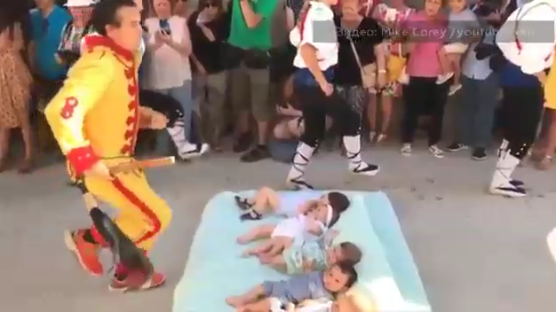 В Испании прошел необычный фестиваль. Мужчины в яркой одежде, символизирующей дьявола, прыгают с разбегу через детей.