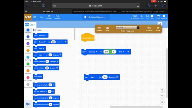 VEXcode VR Aktiviteleri -1 Görevler 1: VR Robotu 3 ızgara karesi ileri gidecek şekilde programlayın. Görevler 2: VR Robotu 6 ızgara karesini ileri, geri dönüp 6 ızgara karesini geri alacak şekilde programlayın. Geldiğiniz yönde olabilmek için kaç derece dönmeniz gerekiyor? Görevler 3: VR Robotu 3 ızgara karesi uzunluğunda bir kare oluşturacak şekilde programlayın.