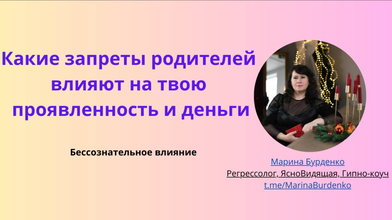 Сегодня в прямом эфире разберем: 💎 Что такое проявленность и что на нее влияет 💎 Как непроявленность влияет на деньги, здоровье, отношения. Почему она стоит дорого 💎 Какие родительские установки блокируют проявленность 💎 Какие родительские программы влияют на медийность 💎 От каких запретов родителей нужно освободиться, чтобы быстрее масштабироваться 💎 Какие родительские запреты влияют на деньги 💎 Алгоритм работы с подсознанием 💎 Практика обнаружения блоков и страхов в проявленность Марина Бурденко | Энергия и деньги t.me/MarinaBurdenko