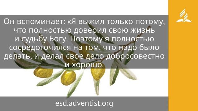 Падут подле тебя тысяча и десять тысяч одесную тебя; но к тебе не приблизится: только смотреть будешь очами твоими и видеть возмездие нечестивым (Пс. 90:7, 8). Когда ты стоишь на кромке прибоя и у твоих ног с шумом разбиваются волны — неукротимая стихия, погубившая многих, ты спокоен, потому что стоишь в безопасном месте. Слова псалмопевца «десятки тысяч падут подле тебя, а ты будешь только смотреть» говорят о том, что верующий смотрит на угрозы со стороны, он отстранен от них. Так израильтяне со стороны смотрят на армию фараона, которая тонет в море. Так пророки со стороны наблюдают панораму истории, где «Бог поставляет царей и низлагает царей». Господь как бы говорит Своим детям: доверьтесь Мне, стойте и смотрите, как Я справлюсь с этим. Пресвитер Василий Чумак два года провел на фронте, где средняя продолжительность жизни солдата была всего две недели, и не получил ни одного ранения. Он вспоминает: «Я выжил только потому, что полностью доверил свою жизнь и судьбу Богу. Поэтому я полностью сосредоточился на том, что надо было делать, и делал свое дело добросовестно и хорошо. Если снаряд перебивал провод, я, не ожидая, пока закончится обстрел, вылезал из окопа и бежал под градом осколков к воронке от только что разорвавшегося снаряда, чтобы соединить концы перебитого провода и восстановить связь. Если я видел, что щуплая санитарка не может справиться с тяжелым раненым, то под пулями бежал к ней на подмогу. В общем, делал все, что требовала делать моя совесть, и, устав, не думал о последствиях. Страха у меня никакого не было. Раз я решил для себя этот вопрос, то больше о нем старался не думать. Я просто знал, что приду домой здоровым и невредимым. Потому что в Библии сказано, что если человек доверяется Богу, то „падут подле него тысяча и десять тысяч одесную его; но к нему не приблизится“. Библия — Слово Божье, а Бог никогда не обманывает!» https://esd.adventist.org/library/periodicals/ezhednevnyie-chteniya/ #адвентисты #АдвентистыСедьмогоДня #Церковь #ЦерковьАдвентистовСедьмогоДня #ЦерковьХристианАдвентистовСедьмогоДня