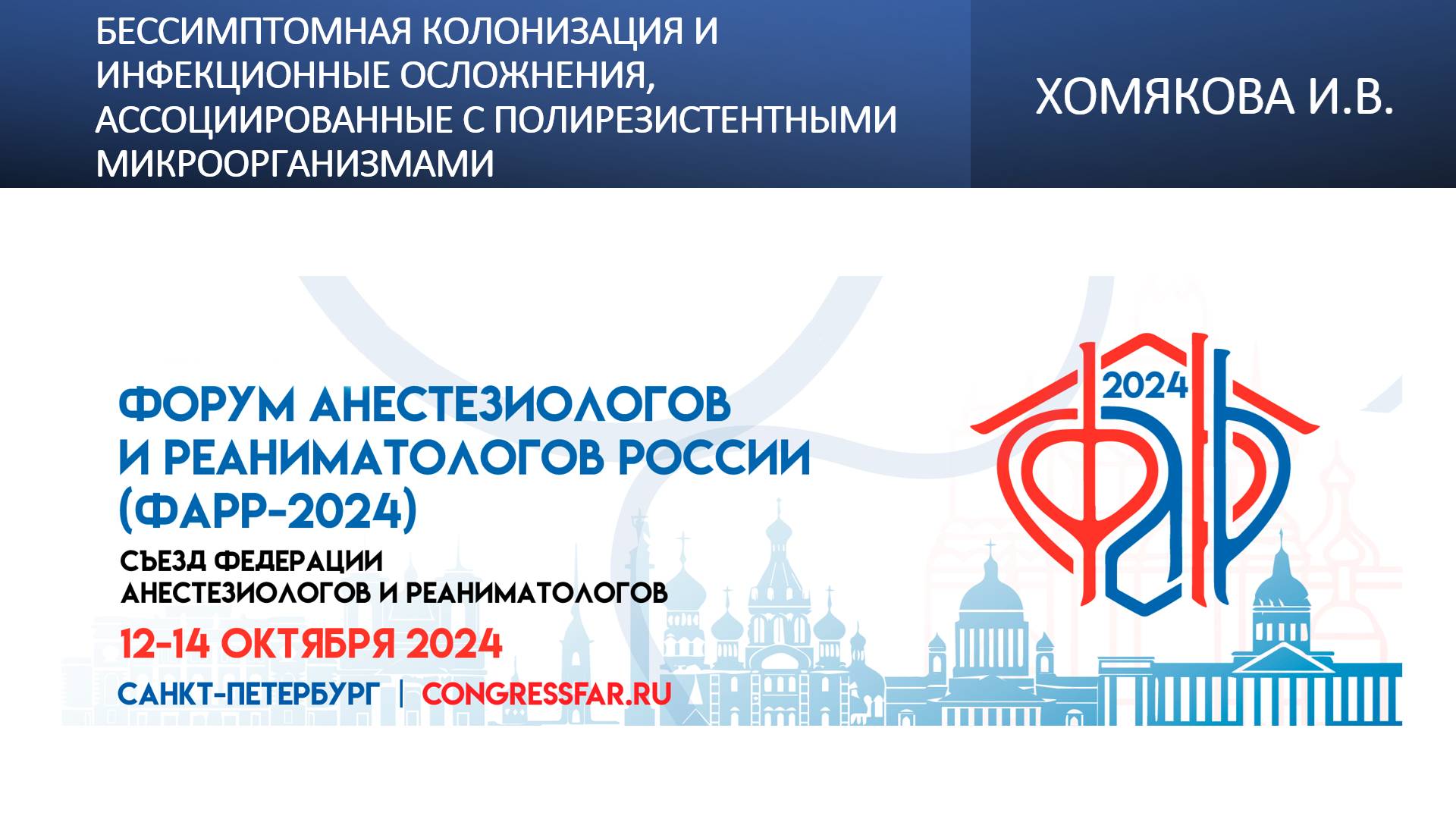 Видеозапись ФАРР-2024, XXII съезд Федерации анестезиологов и реаниматологов 12-14 октября 2024, Санкт-Петербург. Ирина Владимировна Хомякова "Бессимптомная колонизация и инфекционные осложнения, ассоциированные с полирезистентными " Информация, размещенная на канале, предназначена исключительно для медицинских специалистов