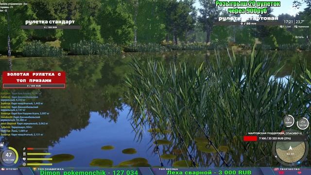 Поддержка донатом https://new.donatepay.ru/@1032463 Альтернативный донат https://www.donationalerts.com/r/kalyamba11 5536913964533059 карта Тинькоф Если стрим лагает,смотри стрим на трово https://trovo.live/s/Kalyamba_na_Ribalke Мой ВК - https://vk.com/kalyantv НИК в игре kalyan11 НАШ ДИСКОРД СЕРВЕР https://discord.gg/4ZzSQkQtsK Заказ водоема на 1 час - 500р ( весь стрим 2500р ) Модерка на канале 1200р ( каждая следующая на 100р больше) Озвучка доната на 40р,50р,100р,200р,300р,500р,1000р ✅Призы в рулетке "ЗОЛОТАЯ" ✔ ЗОЛОТО ✔ ПРЕМ ✔ КАТУШКИ РАПТОР 40, АЗИМУТ 10000, СИЛЬВЕР 80, ТАЙГА с 30 ✔ ПАЛКИ ПИЛКЕРНАЯ, ДОНКА МОРСКИЕ, ✔ РОД ПОД, СТУЛЬЯ ✅Призы в рулетке СТАНДАРТ : ✔ катушка "РАПТОР 40" ✔ катушка "АЗИМУТ 10000" ✔ катушка "ТАЙГА С30, С40," ✔ катушки 60 для медного ( ЭВИИ, НАТОРЫ, ГОЛДА, и тд) ✔ ПИЛКЕРНОЕ УДИЛИЩЕ КОРОЛЕВА ОКЕАНА ✔ Морское Донное удилище ✔ прем ( 3, 7, 30 дней) ✔ золото ( 1, 3, 5, 10, 20 ,50) ✔ билет на море ( 1, 3, 5 дней) ✔ голд наживка и др. ✅Призы в рулетке "СТАРТОВАЯ" ✔ катушка "silver80" ✔ катушка "БЕЛЫЙ КАЛИБР" ✔ катушка "Черный калибр" ✔ катушка "Протон" ✔ катушка "Нарга 6000" ✔ Набор Фидерист и спинингист ✔ Карповик Фортуна ✔ фидерные удилища ✔ прем, золото, алкашка, наживки и тд P.s Рулетка это не казино, а награда за поддержку стримера. Вечный ТОП ПОДДЕРЖКИ (11.05.2024) 1. Dimon_pokemonchik 119 784 2. Interceptor 75 508 3. Skreb79 71 261 4. une personne 68 619 5. Нарвал77 31 550