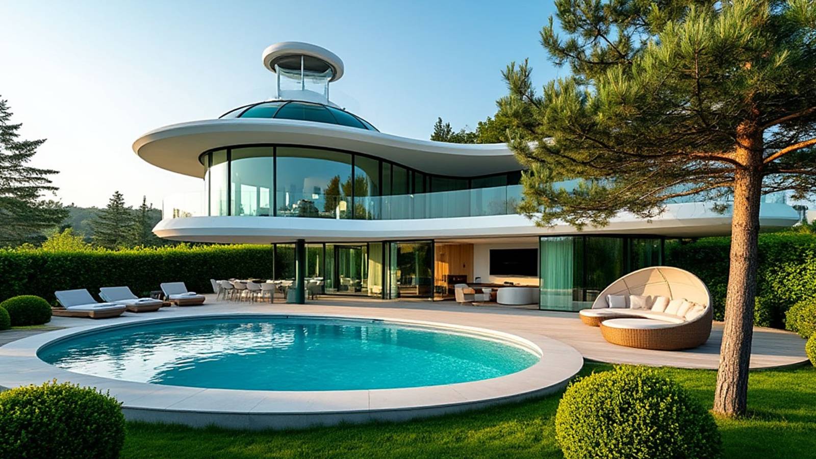 Футуристический загородный дом будущего — это гармоничное сочетание передовых технологий, экологичности и эстетики, созданное для комфортного отдыха и единения с природой.