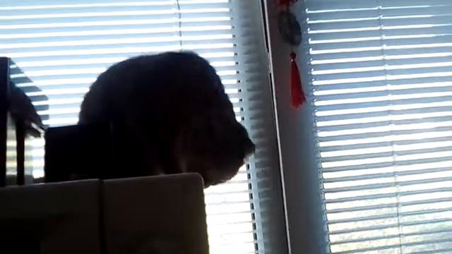 Кошка раздвигает лапами жалюзи