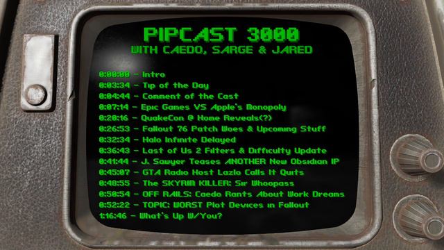 Pipcast 3000 Playlist: https://www.youtube.com/playlist?list=PLLPYDizvwv8fx3VEPfye6WysdkeKgxbvz This is a Fallout and gaming oriented discussion, bi-weekly podcast that takes place on every other Sunday! The PIPCAST 3000 features me (Caedo), BADCompanySarge and Jared of Jar Red Gaming. Come hang out with us as we talk gaming news, Fallout lore, tips and trends! ● JnB Boiz Podcast: https://www.youtube.com/watch?v=_uC5COIxxFo [JAR RED GAMING] ● Channel ► https://www.youtube.com/channel/UC9YUM6bdyFzE9On99KvEOmw ● Patreon ► https://www.patreon.com/JarRedGaming ● Discord ► https://discord.gg/rfK9un6 ● Twitter ► https://twitter.com/Real_Jar_Red [BADCOMPANYSARGE] ● Channel ► https://www.youtube.com/channel/UCTjMoP3OH9WJA3Td4jd7xCA ● Patreon ► https://www.patreon.com/badcompanysarge ● Discord ► https://discord.gg/WSFGVdS ● Twitter ► https://twitter.com/BADCompanySarge [CAEDO GENESIS] ● PATREON ► https://www.patreon.com/CaedoGenesis ● MERCH ► https://teespring.com/stores/caedos-caravan ● Discord ► https://discord.gg/ZSpaCnt ● Facebook ► https://www.facebook.com/CaedoGenesis/ ● Twitter ► https://twitter.com/Caedo_Genesis [TOPICS] ● Epic VS Apple - https://cdn2.unrealengine.com/apple-complaint-734589783.pdf ● Juicehead’s Quakecon Roundup - https://www.youtube.com/watch?v=2qSgpYAjvMo -Doom Eternal DLC Trailer Teaser Trailer -Ghostwire Tokyo You Can Pet The Dog (twitter link) -76 Colossal Problem Event Preview -Arkane Talk About Deathloop? -ESO Dark Heart of Skyrim Stuff ● Fallout 76 Inside The Vault - https://bethesda.net/en/article/72tNixuDqBoHEVDsI3Dc29/fallout-76-inside-the-vault-pts-a-colossal-problem-and-meat-week-begin-soon?utm_content=Fallout_76&utm_source=Launcher ● Halo Infinite Delayed - https://www.pcgamer.com/uk/halo-infinite-delayed-to-2021/ ● Last of Us II Difficulty Modifiers and Filters - https://blog.playstation.com/2020/08/11/the-last-of-us-part-ii-update-adds-grounded-difficulty-permadeath-mode-and-more/ ● Obsidian and Josh Sawyer working on secret project - https://www.pcgamer.com/uk/obsidian-is-working-on-something-that-isnt-avowed-or-grounded/ ● GTA radio host Lazlow leaves Rockstar - https://www.pcgamer.com/gta-radio-host-lazlow-leaves-rockstar/ ● Sir Whoopass - https://store.steampowered.com/app/1240590/Sir_Whoopass__Action_RPG/ Devs - http://atomicelbow.com/ [GUIDES & WALKTHROUGHS] ● FALLOUT 76 GUIDES ► https://www.youtube.com/playlist?list=PLLPYDizvwv8emEZIfOWWhH1gszNBQWiQm ● FALLOUT 1 GUIDES ► https://youtu.be/lE0aEidoGrs?list=PLLPYDizvwv8dfwWyL-QZiiIhc9amkExAp ● FALLOUT 3 GUIDES ► https://youtu.be/_AbTKQdWFWk?list=PLLPYDizvwv8dn6ZpoWnbu6XgXc4VFQXCp ● FALLOUT NV GUIDES ► https://youtu.be/kM_9M-WgAG0?list=PLLPYDizvwv8e79ILzNqQoaess50QfJ_gW ● FALLOUT 4 GUIDES ► https://youtu.be/X4-w3Z1pVWw?list=PLLPYDizvwv8dyfepemYkGIWCO26jNCDjR ● TESV: SKYRIM GUIDES ► https://youtu.be/ADR1k9VWq2I?list=PLLPYDizvwv8fqRLiJhgdrIZH5Y2BTQ5wX ● WASTELAND 2 GUIDES ► https://youtu.be/CV4A7rfy2Lc?list=PLLPYDizvwv8cn8IJLwn9j2V2J7jrxrDMX ● PREY GUIDES ► https://youtu.be/qwLf4M7JYSE?list=PLLPYDizvwv8e8p_79bME6brWS26UnvedI ● DEUS EX: MANKIND DIVIDED GUIDES ► https://youtu.be/x5Nwu-2Jid8?list=PLLPYDizvwv8dS91Yq0oUU2_WH7bFM9EDC ● ONE-OFF GUIDES ► https://youtu.be/sYFmFDLriVU?list=PLLPYDizvwv8cOTE4Md3fvQenhjw0STYj8 [BUILDS VIA SARGE] ● Fallout 76 ► https://www.youtube.com/watch?v=nKSNWR5_rGU&list=PLDzUsSDSb25_LVSYQL-5pmedKEvrsGFv2 ● Fallout 4 ► https://www.youtube.com/watch?v=5XMhUf_Tkbc&list=PLDzUsSDSb2599kgqLDFILDiHB1w2G2kyL ● TESV: Skyrim ► https://www.youtube.com/watch?v=6JV10lMX_7s&list=PLDzUsSDSb258IcywYG7wT4wmYPtD8lqKe #falloutpodcast #pipcast3000 #gamingpodcast