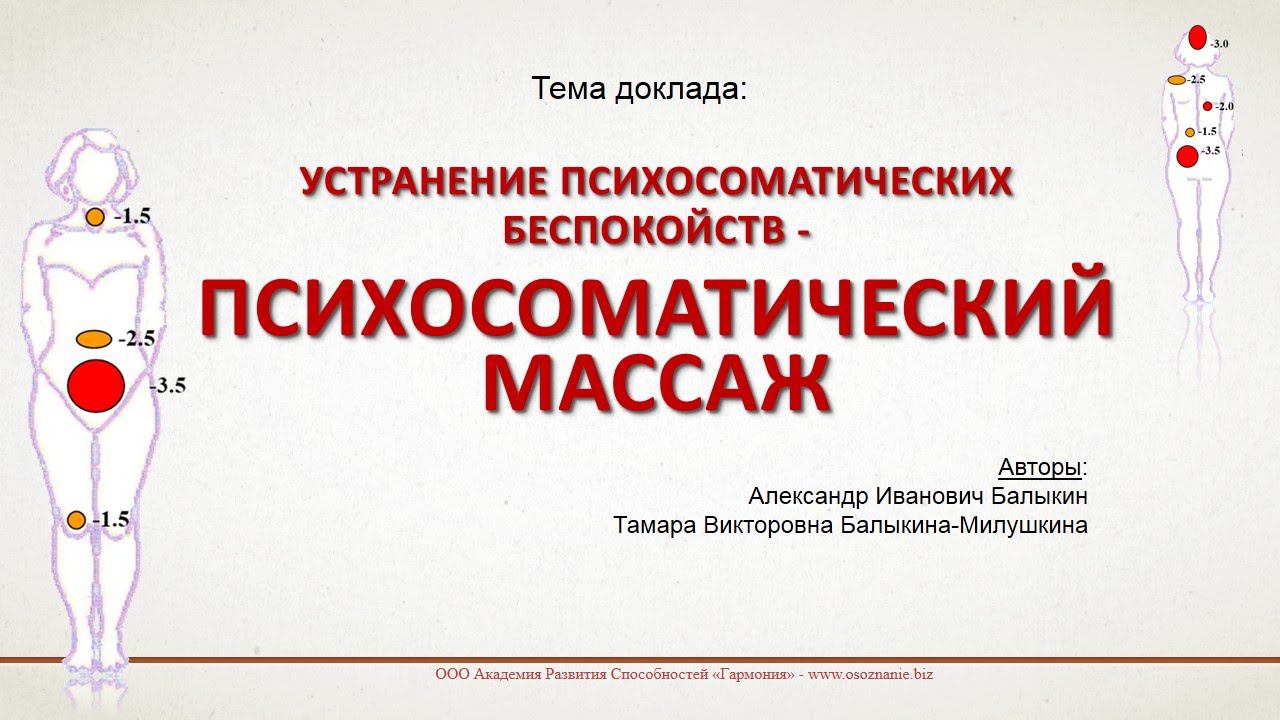 Много моих видео http://iper1k.ru/novosti.html Психосоматические беспокойства - это физические (физиологические) расстройства имеющие психологические причины (по разным источникам от 60 до 80% всех заболеваний являются психосоматическими). Следовательно, этиологическим лечением психосоматических беспокойств является работа с психологическими причинами – то есть необходимо проводить психологическую коррекцию по устранению причин психосоматических беспокойств. Приборы для самопознания или для психологической консультации - http://www.iper1k.ru Техники саморазвития - психологическая консультация - http://www.osoznanie.biz Мой канал на youtube - https://www.youtube.com/user/Ivanovih808 --------- Подборка наших видео научных докладов по темам - спортивная психология - педагогика - самопознание - бизнес https://www.youtube.com/playlist?list=PLbNVCpO4w-QlmIzZmpEe8gqi9vSsDKw42 --------- Подборка видео-семинаров для людей, занимающихся саморазвитием и самопознанием. https://www.youtube.com/playlist?list=PLbNVCpO4w-Qk2m38hJNHIMBLvV5vT8Ap3 --------- Подборка для психологов, психотерапевтов, коуч, педагогам, медикам, социальным работникам - видео семинаров по проведению психодиагностики и психокоррекции нежелательных состояний у клиентов. https://www.youtube.com/playlist?list=PLbNVCpO4w-Ql_O5OIz6PANIWEHXdq0nGs --------- Подборка видео семинаров по межличностным взаимоотношениям, семейной жизни, воспитанию детей. https://www.youtube.com/playlist?list=PLbNVCpO4w-Qm5QjmKJqQ5HGLVeTSZaSM6 --------- Подборка для кадровиков, эйчаров, HR-специалистов, руководителей и собственников компаний - видео семинаров по отбору, проверке, обучению и управлению персоналом. https://www.youtube.com/playlist?list=PLbNVCpO4w-QnejSf2iD67U29zWeFIN912 --------- Подборка для спортсменов и тренеров - видео семинаров по спортивной психологии https://www.youtube.com/playlist?list=PLbNVCpO4w-QkZSP_MiMHns9xBPiNle6Lt --------- Все наши публикации в научных журналах, а также видео семинаров и мастер-классов, можно скачать по этой ссылке http://www.iper1k.ru/images/upload/00_publikasii_garmonii.pdf