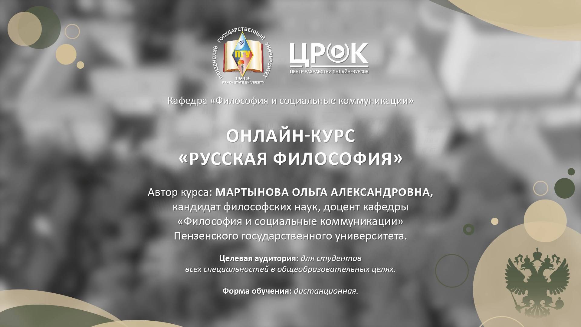 Онлайн-курс "Русская философия" Автор курса: Мартынова Ольга Александровна, кандидат философских наук, доцент кафедры "Философия и социальные коммуникации" Юридический институт Пензенский государственный университет