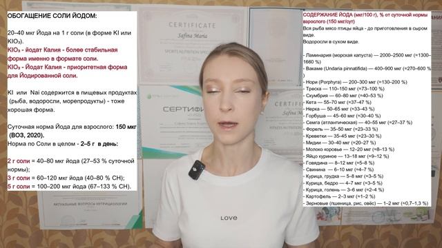 Тайм-коды: 1) 00:00 Формы Йода и биодоступность; 2) 2:18 Йодированная соль, йодат калия; 3) 3:40 Как правильно использовать йодированную соль; 4) 5:45 Функции йода в организме; 5) 6:48 Йод в морских водорослях; 6) 8:57 Рыба, морепродукты как источники йода; 7) 10:53 Что снижает усвоение йода; 8) 12:02 Йод в других продуктах (зерновые, мясо, птица); 9) 12:45 Выводы: йодированная соль в питании. 11:40 Оговорка "Пересыпание СОЛИ в солонки, даже йодированной" Я использую именно такую соль, именно в такой упаковке: https://vkusvill.ru/goods/sol-morskaya-setra-pishchevaya-yodirovannaya-melkaya-p-b-250-g-44585.html (Соль морская Setra пищевая йодированная мелкая) Мой Телеграм: https://t.me/fitnessmaria Мой сайт: https://maria-safina.ru/ Запись на мой авторский курс «Искусство Здорового Рациона»: https://maria-safina.ru/iskusstvo-zdorovogo-raciona Участие в группе «Готовый Рацион»: https://maria-safina.ru/gotovye-raciony-ot-nutriciologa Участие в группе «Разборы Составов Продуктов»: https://t.me/tribute/app?startapp=szwD Участие в марафоне Здоровых Привычек Марии Сафиной: https://kurs.maria-safina.ru/marafon-zdorovyh-privychek-marii-safinoj Запись на мой авторский курс «Пищевые Жиры и Здоровье»: https://kurs.maria-safina.ru/kurs-pishchevye-zhiry-i-zdorove Мои сертификаты и дипломы: http://maria-safina.ru/obo-mne Бесплатная книга «Искусство Здорового Рациона» на Литрес: https://www.litres.ru/book/mariya-safina/iskusstvo-zdorovogo-raciona-dokazatelnaya-nutriciologiya-dly-70496446/ Подробнее о «Дне Здоровья» и других корпоративных программах: https://maria-safina.ru/den-zdorovya Источники, которые я использовала для создания видео: 1. Zimmermann, M. B. & Andersson, M. (2012). Update on iodine status worldwide. Endocrine Reviews, 33(6), 704–746. https://doi.org/10.1210/er.2012-0011 2. Teas, J., Pino, S., Critchley, A., & Braverman, L. E. (2004). Variability of iodine content in common commercially available edible seaweeds. Thyroid, 14(10), 836–841. https://doi.org/10.1089/thy.2004.14.836 3. Pearce, E. N., Andersson, M., & Zimmermann, M. B. (2013). Global iodine nutrition: where do we stand in 2013? Thyroid, 23(5), 523–528. https://doi.org/10.1089/thy.2013.0128 4. WHO & UNICEF. (2007). Guidelines for iodine fortification and supplementation. World Health Organization. https://www.who.int/publications/i/item/9789241595827 5. Hetzel, B. S., & Delange, F. (2000). The iodine deficiency disorders and their eradication. Annual Review of Nutrition, 20, 379–415. https://doi.org/10.1146/annurev.nutr.20.1.379 6. Chavasit, V., Malaivongse, P., & Judprasong, K. (2002). Study on stability of iodine in iodized salt by use in households and small industries. Food and Nutrition Bulletin, 23(3 Suppl), 292–299. https://doi.org/10.1177/15648265020233S303