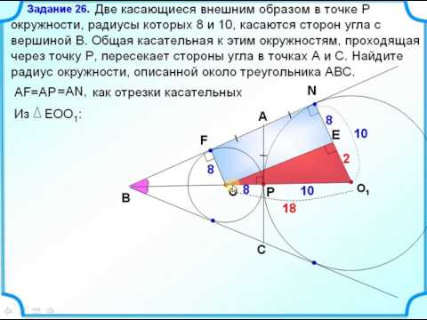 Две касающиеся внешним образом в точке Р окружности, радиусы которых 8 и 10, касаются сторон угла с вершиной В. Общая касательная к этим окружностям, проходящая через точку Р, пересекает стороны угла в точках А и С. Найдите радиус окружности, описанной около треугольника АВС.