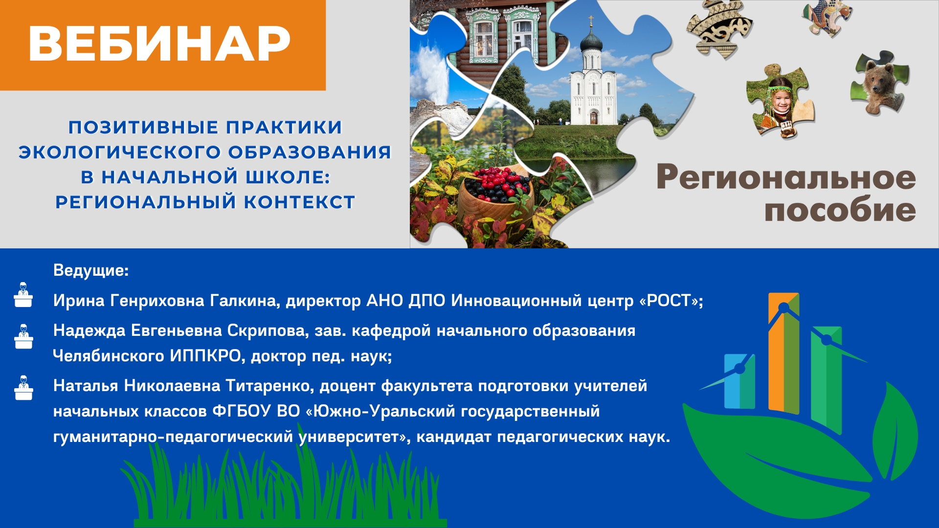 Ведущие: Ирина Генриховна Галкина, директор АНО ДПО Инновационный центр «РОСТ»; Надежда Евгеньевна Скрипова, зав. кафедрой начального образования Челябинского ИППКРО, доктор пед. наук; Наталья Николаевна Титаренко, доцент факультета подготовки учителей начальных классов ФГБОУ ВО «Южно-Уральский государственный гуманитарно-педагогический университет», кандидат педагогических наук. Основные вопросы вебинара: На вебинаре речь пойдет о значении экологического образования в начальной школе и о региональном аспекте в организации этой деятельности. https://русское-слово.рф/ Присоединяйтесь к нам в социальных сетях! Телеграм: https://t.me/rslovo ВКонтакте: https://vk.com/rus_slo Одноклассники: https://ok.ru/group/57720246435859 #Русское_слово #Вебинары_РС #русскоеслово #начальнаяшкола #экология ##Челябинск