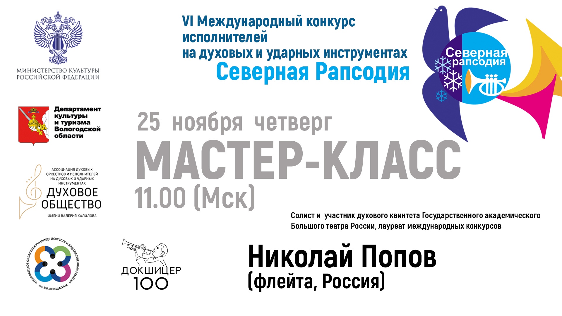 Мастер-класс члена жюри VI Международного конкурса исполнителей на духовых и ударных инструментах "Северная Рапсодия". Солист и участник духового квинтета Государственного академического Большого театра России, преподаватель Московского государственного института музыки им. А.Г. Шнитке, лауреат международных конкурсов
