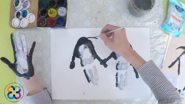 Мастер-класс «Пингвины» Техника: нетрадиционная, «ладошками» Возраст: младший дошкольный -2-5 лет Материалы: гуашь, кисти, бумага А3, банка для воды Преподаватель: Т.С. Носкова