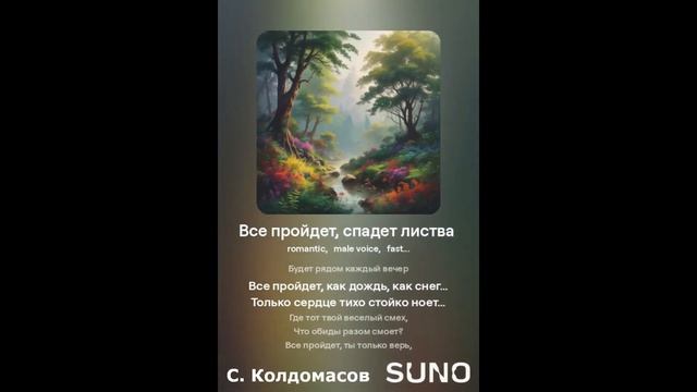 Романтика! Текст - С. Колдомасов Аудио и визуал - Suno AI Стихи: Сергей Колдомасов - "Все пройдет, спадет листва" (2023/07/02) (на сайте стихи.ру). Никакой вульгарщины или пропаганды, все совпадения чисто совпадения!