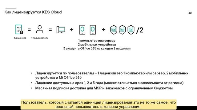 Как лицензируется Kaspersky Endpoint Security Cloud. Kaspersky Endpoint Security Cloud разработан для нужд малого и среднего бизнеса и позволяет удаленно управлять защитой устройств под управлением Windows, MacOS, iOS и Android с помощью облачной консоли. Больше на Kaspersky Business Hub: https://kas.pr/uc1j. #KESCloud #technicaltraining #KasperskyTechEdu
