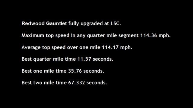 Smarter Gaming playing GTA Online on PS4. Testing top speed on a flat, level stunt track, with check points/gantries every quarter of a mile for 2 miles. Speeds measured to 1/30 of a second (one frame on PS4). All cars are fully upgraded with full performance upgrades (Los Santos Customs - LSC or Benny's). Order is by the average top speed measured over 1 mile...