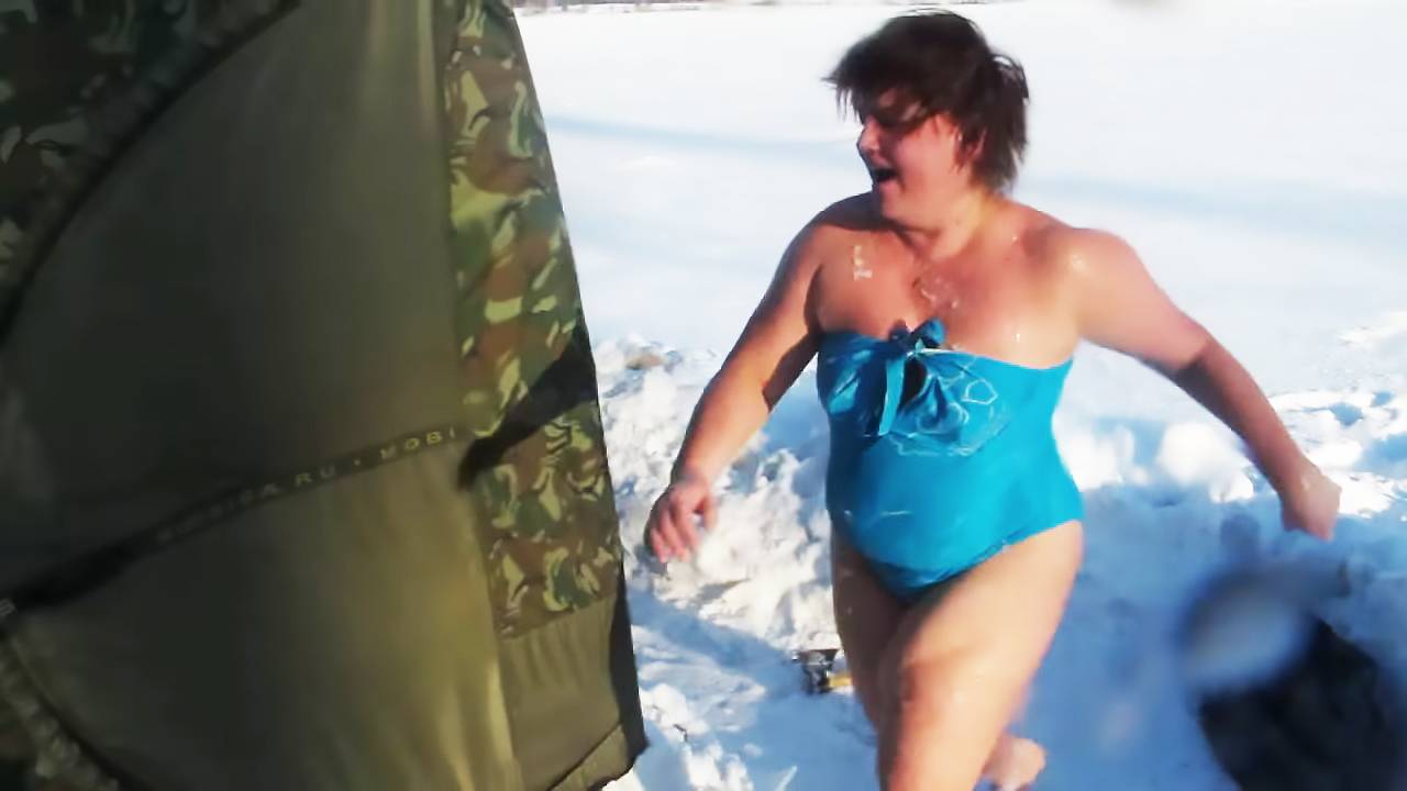 Мобильная баня-палатка МБ-52. Купание в снегу