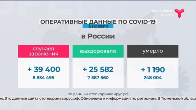 Свыше 39 тыс. новых случаев коронавирусной инфекции выявлено в России за сутки. Выздоровели более 25,5 тыс. пациентов. Скончались 1 190 человек. В Тюменской области 347 тестов показали положительный результат. 96 жителей региона пополнили списки переболевших, 13 - не смогли побороть вирус. http://www.youtube.com/user/TyumenTime?sub_confirmation=1