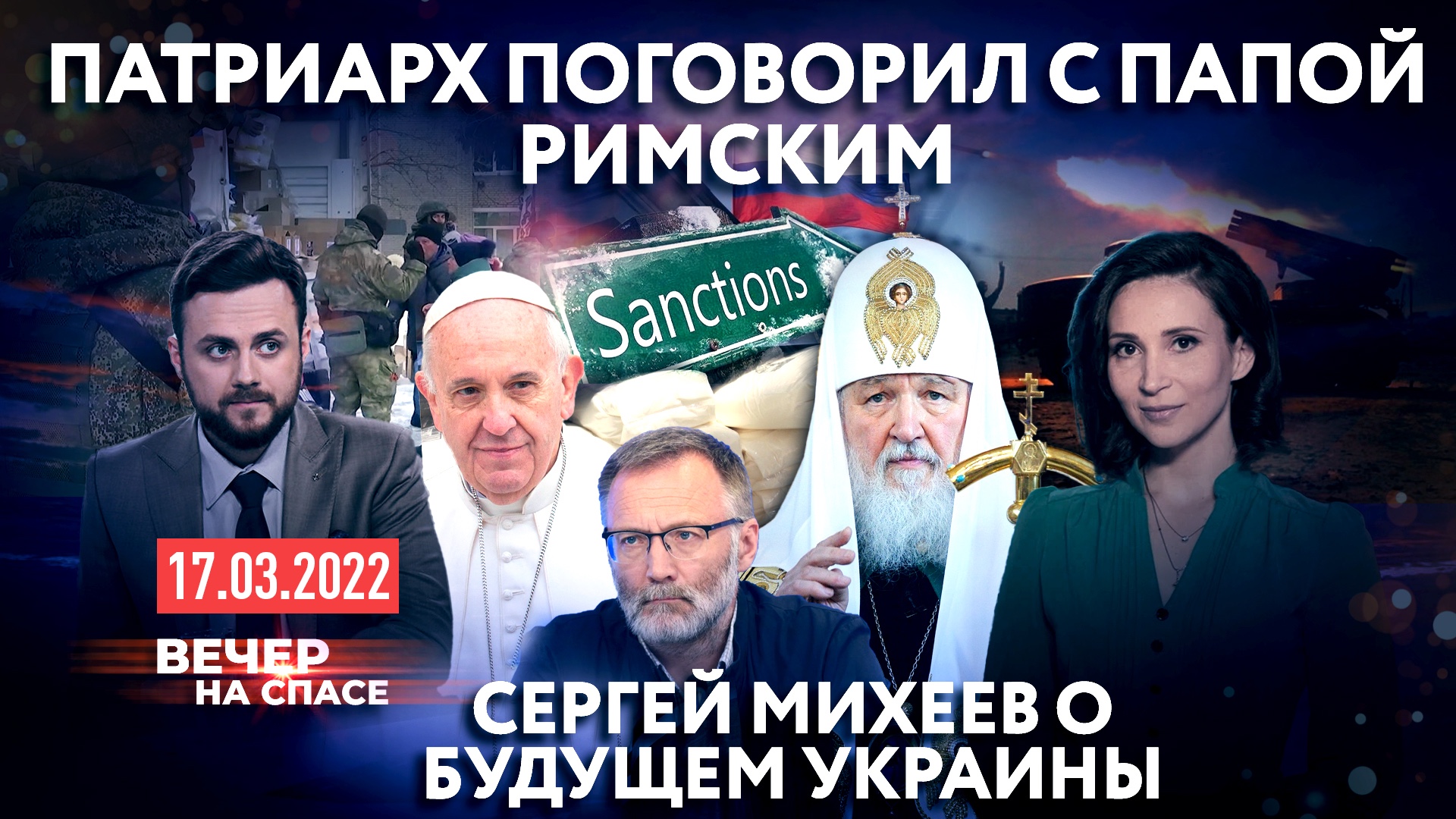 ⚡️В выпуске 17.03.22: ? Митрополит Иларион раскрыл детали беседы Патриарха Кирилла и Папы Римского, Михаил Мишустин назвал недопустимым повышение цен на товары, Владимир Путин пригласил российский бизнес в Крым. Расскажем о главных событиях. ? «И сказал Господь: истреблю с лица земли человеков,..ибо Я раскаялся, что создал их». Разберем Писание дня с отцом Валерием Духаниным. ? Наш особый ВЗГЛЯД на события в стране и мире. Спецоперацию на Украине, санкции против России и трансформацию нашего общества мы обсудим с известным политологом Сергеем Михеевым. ? Тест на правду. Новый выпуск авторской рубрики Игоря Петровского, разоблачающей фейки о Церкви. ? Апокалипсис вслух. Восьмую главу «Откровения святого Иоанна Богослова» прочтет народная артистка РСФСР Светлана Крючкова ЭТО ВЕЧЕР НА СПАСЕ. ГЛАВНОЕ НА СЕГОДНЯ И… ВСЕГДА.