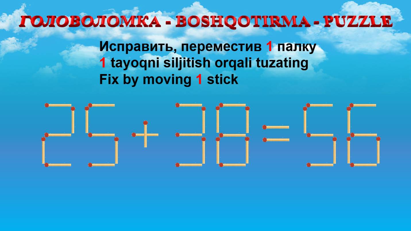 ГОЛОВОЛОМКА - BOSHQOTIRMA – PUZZLE. Спичка. 25+38=56, 39+69=99, 25+64=83, 53+38=93