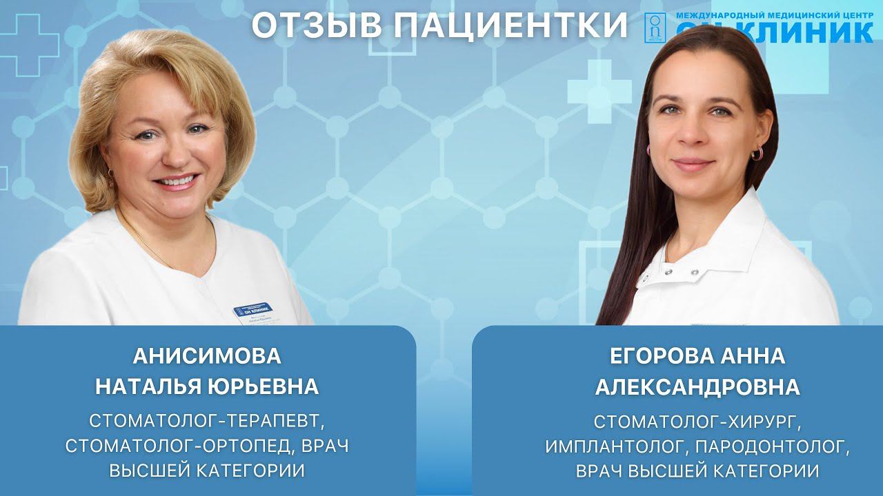 Отзыв пациентки ОН КЛИНИК о: ▫️ Анисимова Наталья Юрьевна- стоматолог-терапевт, стоматолог-ортопед, врач высшей категории, заведующая отделением стоматологии на Цветном бульваре ▫️ Егорова Анна Александровна - стоматолог-хирург, имплантолог, пародонтолог, врач высшей категории Записаться на прием: +7 495 241-69-20 (с 8 до 23.00) Узнайте больше о способах диагностики и лечения в ОН КЛИНИК! Подпишитесь на наш канал! Мы в соцсетях: Телеграм: https://t.me/onclinicru ВКонтакте: https://vk.com/onclinicru Одноклассники: https://ok.ru/profile/577149703061