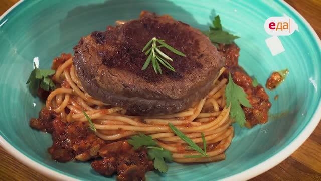 Стейк с пастой в томатном соусе. Салат с фетой и арбузом | Наедине с Мосиным /23